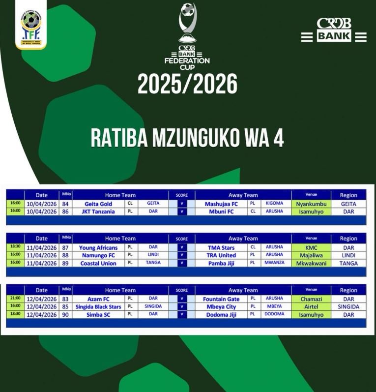 Ratiba ya CRDB Federation Cup 2025/2026 – Mashindano ya CRDB Federation Cup msimu wa 2025/2026 yanaendelea kwa kasi, ambapo ratiba rasmi ya mzunguko wa nne imetangazwa ikihusisha vilabu mbalimbali kutoka Ligi Kuu na madaraja ya chini.