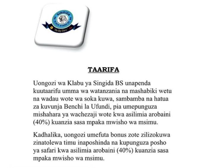 Singida Black Stars Yapunguza Mishahara ya Wachezaji kwa 40%, na Kufuta Bonus Hadi Mwisho wa Msimu. Klabu ya Singida Black Stars imechukua hatua nyingine kubwa ya kiutawala kwa kutangaza kupunguza mishahara ya wachezaji wake pamoja na kufuta mfumo wa bonasi. Hatua hii inakuja sambamba na maamuzi ya awali ya kuvunja benchi la ufundi, ikiwa ni sehemu ya mkakati wa kurekebisha mwenendo wa timu.
